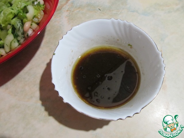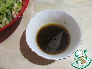 Для заправки смешать оливковое масло, соевый соус, лимонный сок и перец.