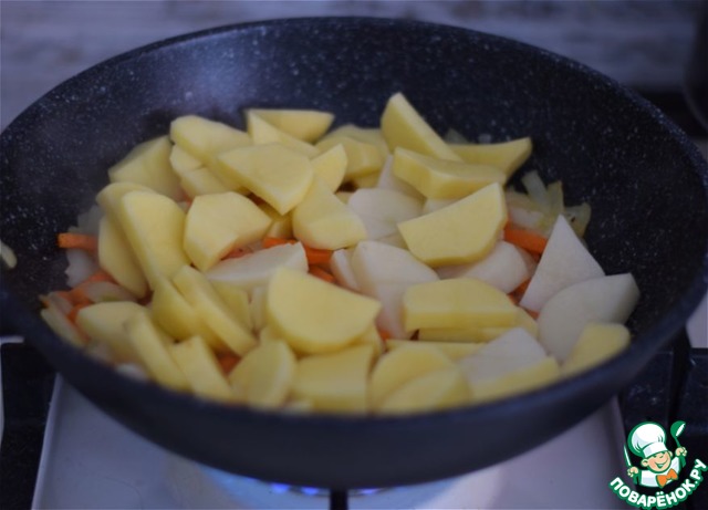 Добавить в сковороду (кастрюлю) крупно нарезанный картофель, перемешать овощи, прикрыть крышкой, убавить огонь до умеренного и готовить блюдо до мягкости картофеля. Периодически перемешивать овощи.