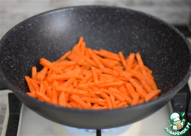 Морковь нарезать не очень крупными брусочками и обжарить в хорошо разогретом растительном масле минуту. Огонь активный. Для приготовления блюда лучше использовать глубокую сковороду или кастрюлю с толстым дном.