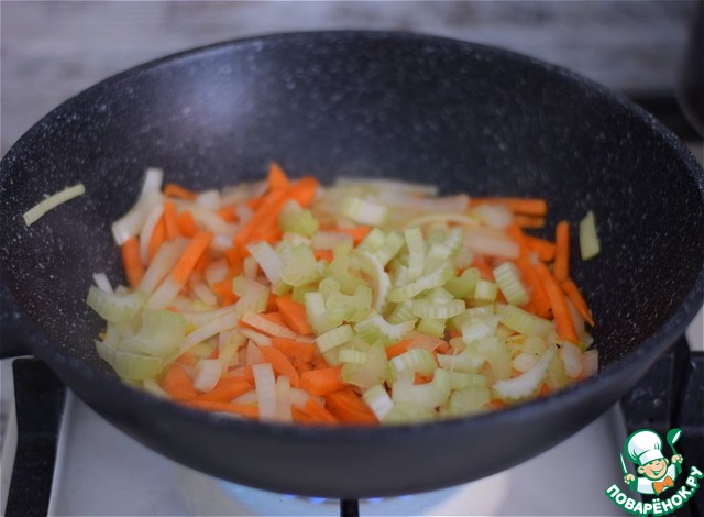 ... и сельдерей. Перемешать, сразу посолить. Овощи дадут сок и будут тушиться, а не жариться.