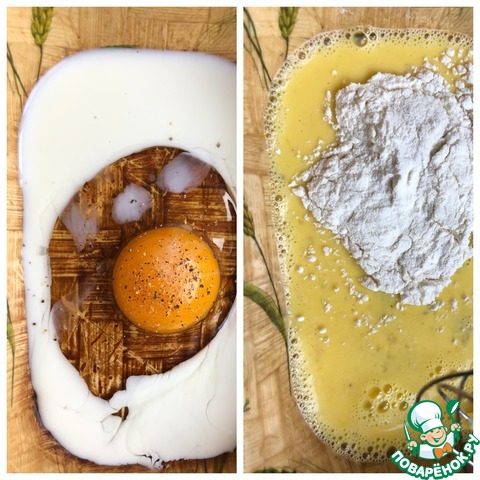 Яйцо взбить с солью, молотый перцем и молоком. Всыпать муку, продолжать взбивать венчиком.