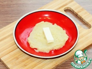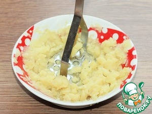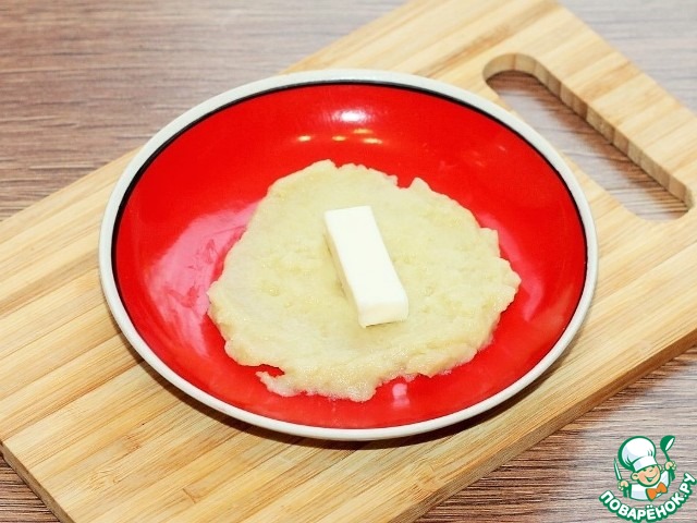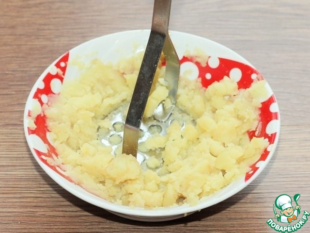 4. Картофель делим на 6 частей. Из каждой части лепим лепешки и кладем по кусочку сыра.