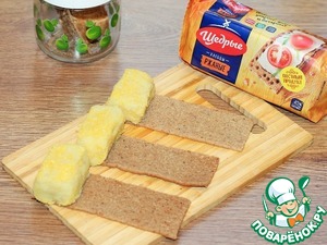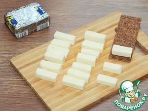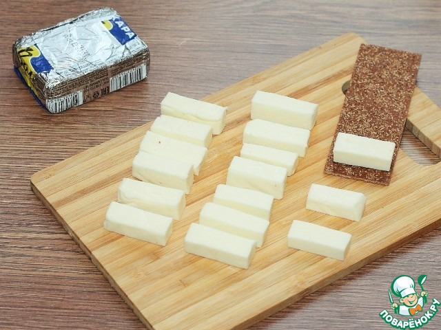 3. Плавленный сырок разрезаем прямоугольничками. Получилось 16 заготовок. Я взяла для рецепта 6 штук.