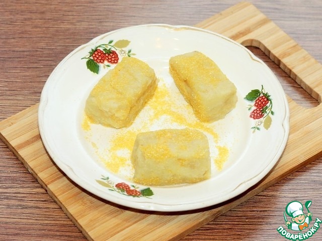 5. Закрываем кусочек сыра картофелем и обваливаем в кукурузной муке. Кладем картофельные заготовки в морозилку, минут 20.