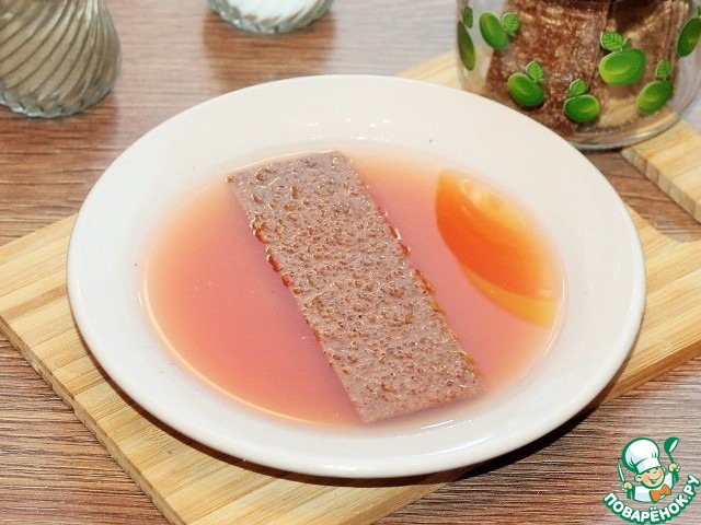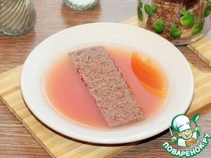 6. Томатную пасту размешиваем в горячей воде, солим и перчим. Хлебцы кладем в томатную смесь и оставляем их до размягчения, минут 10. Затем хлебцы достаем и выкладываем на бумажное полотенце.