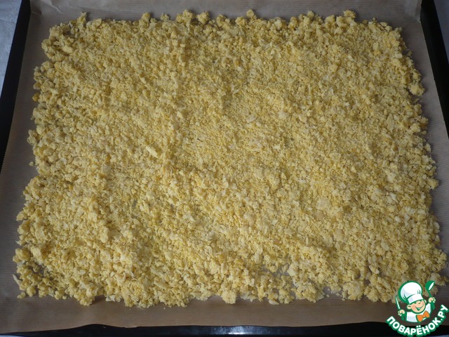 Просушить в духовке при температуре 150 градусов до получения рассыпчатой текстуры (ориентируйтесь на свою технику).