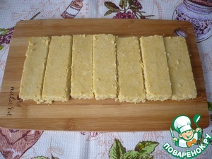 Когда тесто хорошо охладится, выньте из формы и нарежьте кусочками нужной формы: прямоугольниками, тонкими палочками, квадратами или скатайте в ролл и нарежьте шайбами.