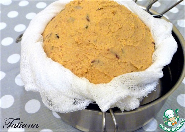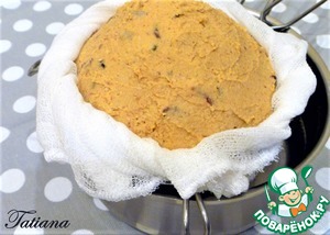 Или можно придать паштету форму шара: в небольшое сито (d ~ 14-16 см.)вложите марлю в два слоя, выложите чечевично-ореховую пасту, края марли заверните наверх, уберите паштет в холодильник на 6-8 часов.