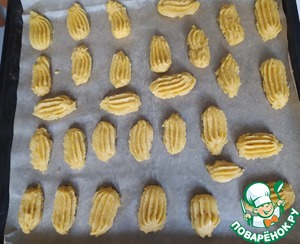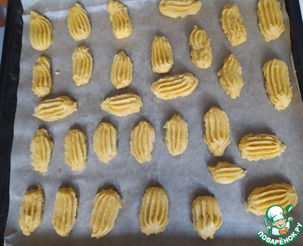 Отсаживала печенье я через двойной целлофановый кондитерский мешок с насадкой. А можно, сформировать из теста грубое полено диаметром примерно 5 см, при необходимости посыпая мукой, чтобы тесто не липло. Острым ножом нарезать печенье на кружки толщиной 1 см. Положите их на подготовленный противень на расстоянии около 3см друг от друга. -
