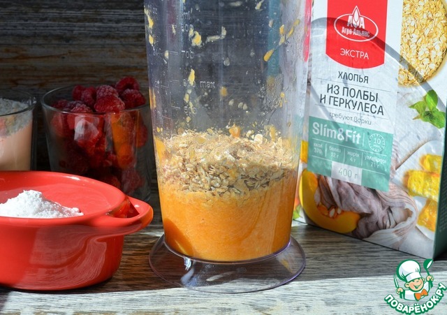 Добавить хлопья и пробить до однордности, я использую хлопья из полбы и геркулеса от ТМ Агро-Альянс.