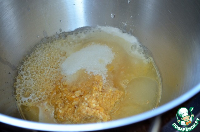 Венчиком взбить мандариновую смесь, сахар, соль, воду и масло.