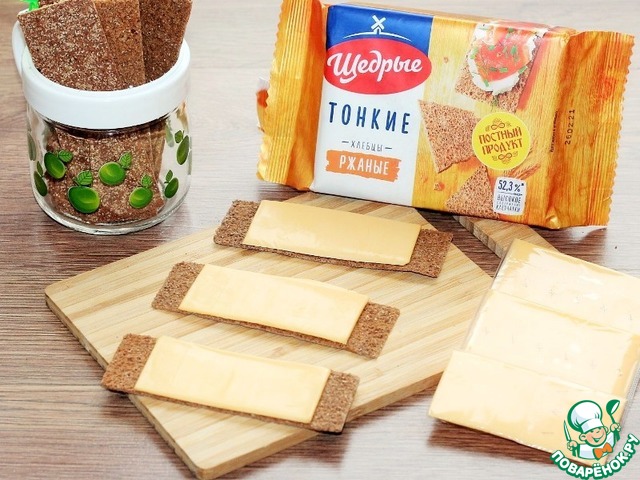• 1. Пластины плавленного сыра разрезаем на 2 части. Выкладываем половину упаковки хлебцев на разделочную доску и раскладываем половинки сыра.