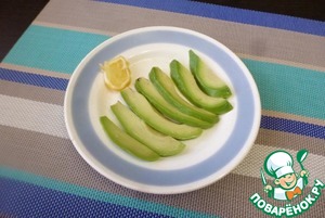 Авокадо нарезать тонкими ломтиками, сбрызнуть соком лимона, чтобы не потемнел.