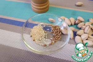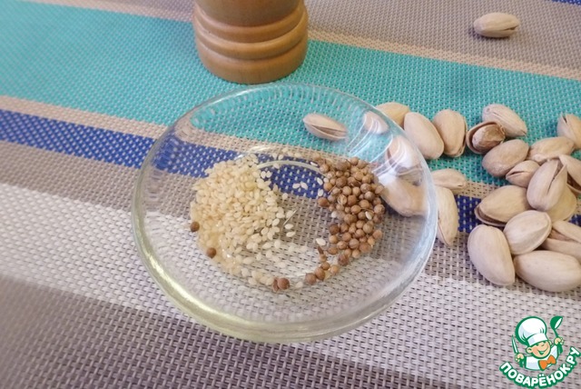 Для ароматной посыпки очистить фисташки от скорлупы. Смешать фисташки, кунжут и кориандр.