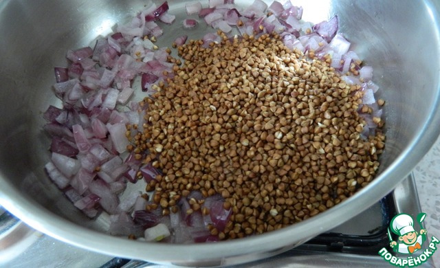 К луку высыпим гречку.