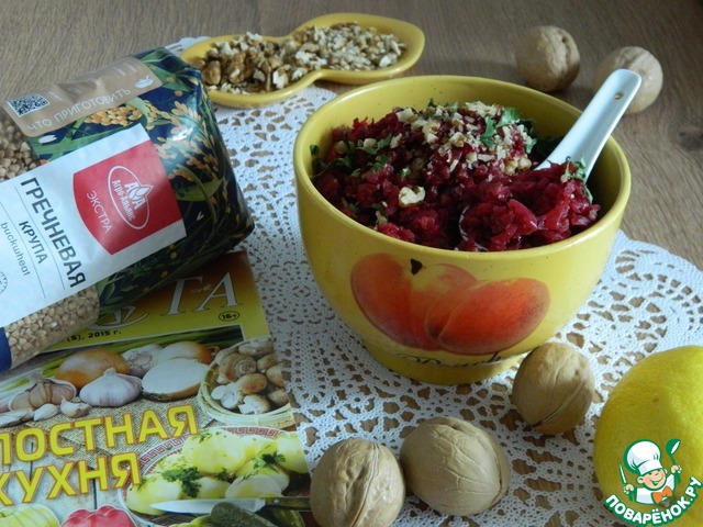 Хочу предложить Вам блюдо из гречки. Оно получается со свеклой особенно вкусным. Благодаря лимону и свекле, грецким орехам блюдо приобретает совершенно новое звучание. Необычно, нежно. Гречка прекрасно сочетается со свеклой. Можно подавать и как гарнир, и как самостоятельное блюдо. Хорошо готовить такое блюдо в пост, оно яркое, аппетитное и разнообразит ваше меню.