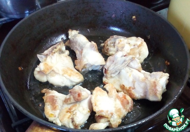 Репчатый лук нарезать полукольцами, пассеровать на умеренном огне с добавлением 1 ст. л. растительного масла и щепотки соли. Выложить на тарелку. На сковороду, где ранее обжаривался лук, добавить 2 ст. л. растительного масла и выложить нарезанные крупными кусками куриные бёдрышки, обжарить со всех сторон до румяной корочки, посолив и поперчив, а также приправив специями по личному усмотрению. Я использовала специи для приготовления курицы.
