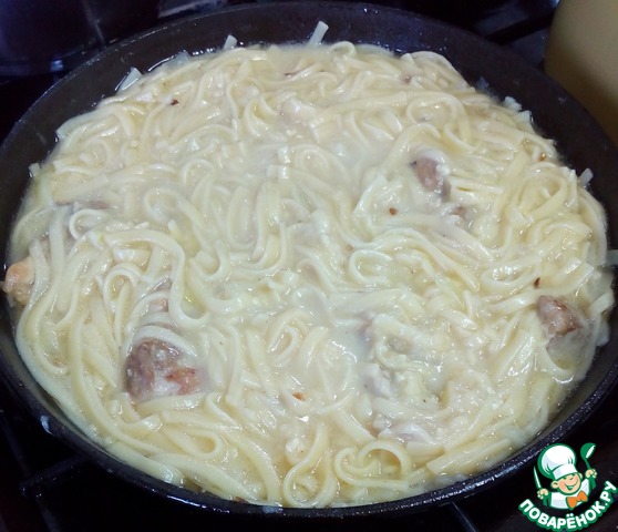 Обжаренные куриные кусочки залить кипячёной водой, дать ей закипеть. Огонь убавить. К курице выложить пассерованный лук и измельчённый плавленый сырок. При необходимости подсолить. Дать сырку полностью раствориться, периодически перемешивая содержимое сковороды лопаточкой.