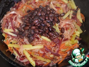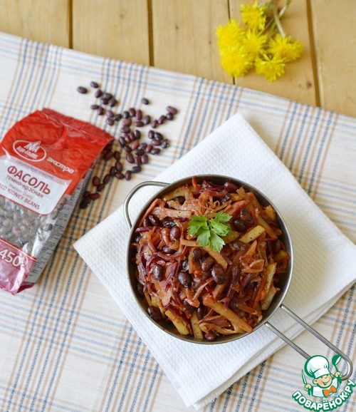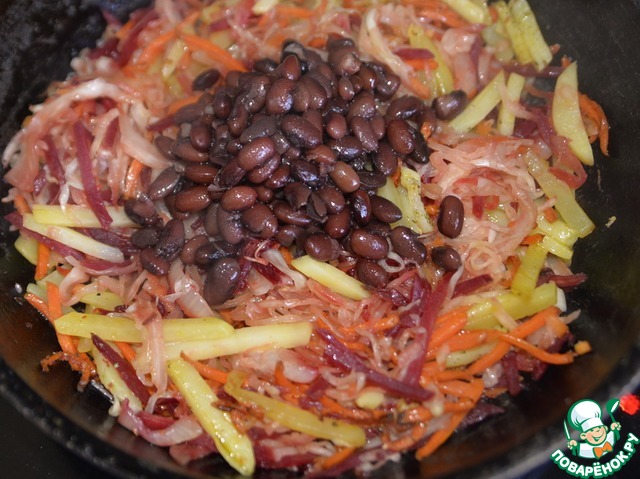 Кладём готовую фасоль, если остался отвар, его тоже можно перелить в рагу.