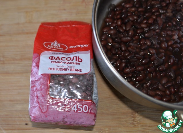 Берём фасоль, я использовала тёмно-красную от Агро-Альянс. Фасоль хорошо промываем, лучше замочить на ночь. Далее воду сливаем, заливаем свежей водой в соотношении 1 к 3, доводим до кипения и варим на среднем огне до готовности, 1-1,5 часа.