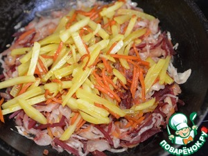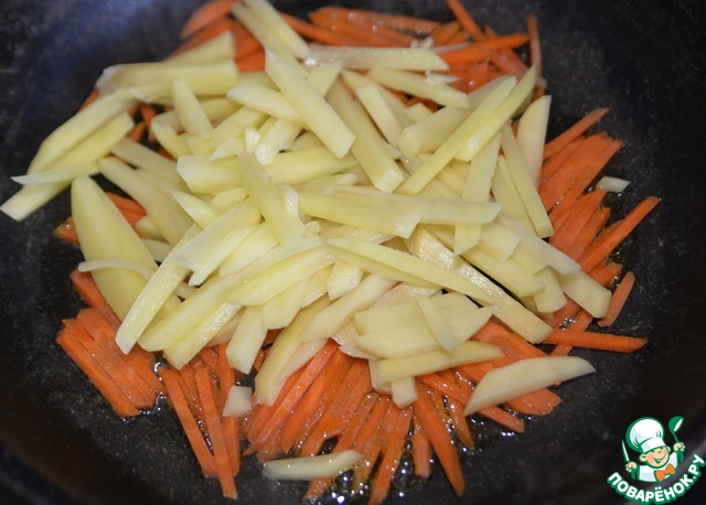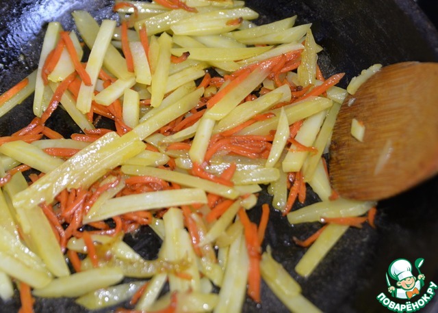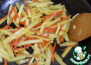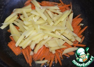 На сковороду наливаем половину указанного количества масла, на среднем огне 5 минут обжариваем морковь, далее кладём картофель и жарим на среднем огне почти до готовности.