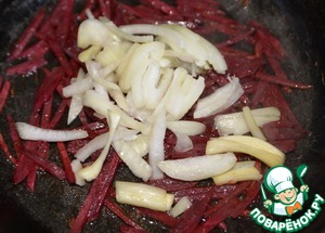 Свеклу режем или натираем тонкими полосками. И обжариваем на сковороде на оставшемся масле на среднем огне 10 минут.