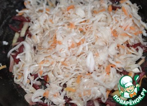 Добавляем квашеную капусту, обжариваем, тушим 10 минут на среднем огне. В данном случае я предпочитаю недожаренную, хрустящую капусту, это на ваш вкус.