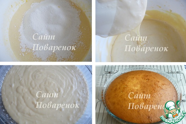 • Добавить цедру лимона, влить лимонный сок. Часть муки смешать с разрыхлителем теста, крахмалом, просеять в массу. Оставшуюся муку вводить частями, взбить миксером. Тесто свободно стекает с лопатки. Форму для выпечки 24-26см, смазать маслом, пересыпать манной крупой (или измельченными орехами), заполнить тестом. Выпекать в разогретой эл. духовки до 170-180С 40мин. до сухой лучины (следите за своей духовкой)