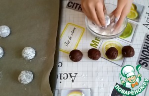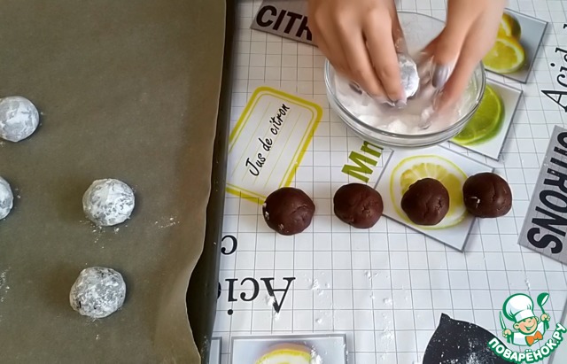 Обваливаем шарики в сахарной пудре и выкладываем на расстоянии друг от друга на противень, застеленный пергаментной бумагой.