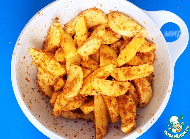Пересыпать картофель в кастрюлю, добавляем все ингредиенты и тщательно перемешаем. Специи должны быть равномерно распределены.