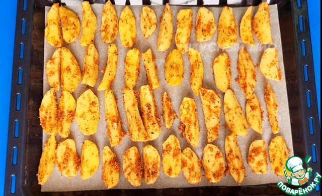 Застилаем противень бумагой для выпечки и выкладываем на него картофель. Выпекаем в разогретой до 180-200°С духовке примерно 40 минут.