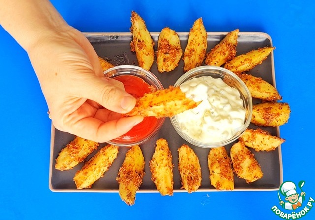Картофель по-деревенски готов! Подавать лучше горячим, не ждать пока остынет. К картофелю подойдёт томатный и сырный соусы, а также сметанно-чесно чный соус. Приятного аппетита!