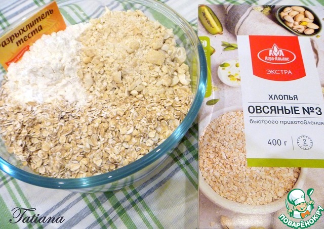 В отдельной миске смешайте сухие ингредиенты :муку+орехи (крупно-измельченные), овсяные хлопья (быстрого приготовления, измельчать не надо)и разрыхлитель.
