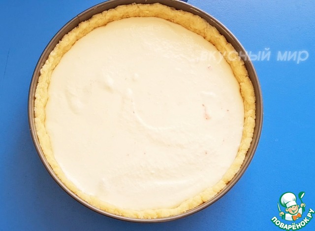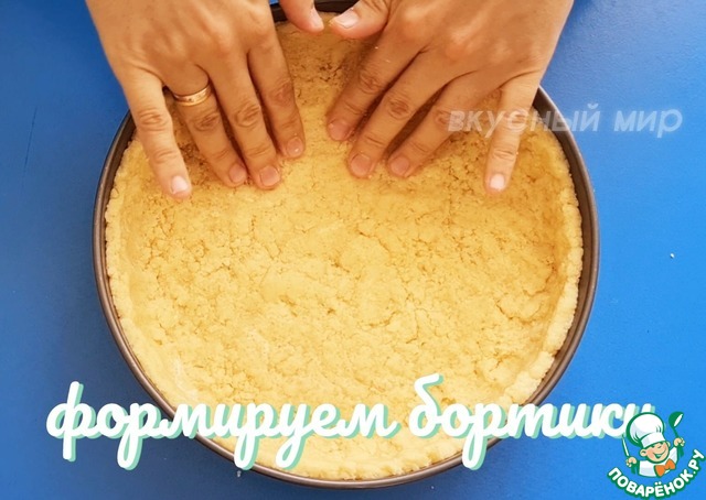 Дно формы застелить пергаментом, пересыпаем крошку в форму и распределяем ровным слоем формируя небольшой бортик.