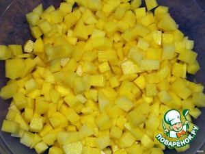 Берем наши вкусные копчености. Все нарезаем кубиками; я еще добавила кусочек вареной колбаски (сфоткать забыла)