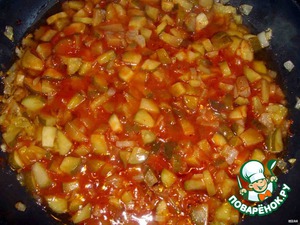 Добавляем к луку наши огурчики и томатную пасту, еще пару минут все это обжариваем.