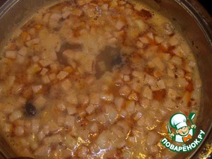 Потом туда же, в бульон, отправляем нашу зажарку (лук с огурцами) и все обжаренные копчености.