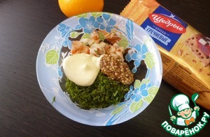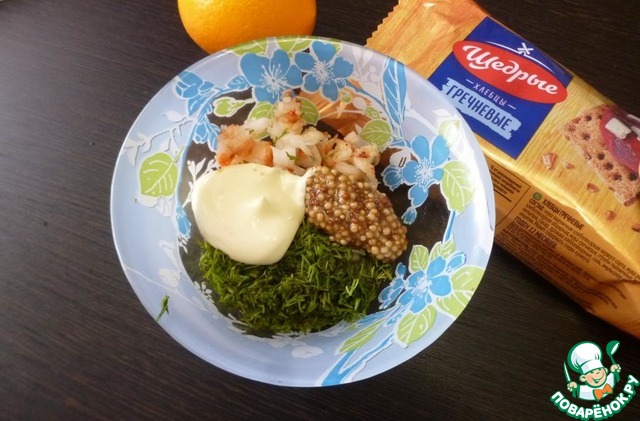 Креветки нарезать кусочками, если у вас мелкие, то можно оставить целыми. Укроп мелко нарезать. Соединить креветки, укроп, горчицу и майонез. Перемешать.
