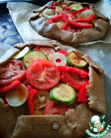 До чего я люблю галеты: с ними мало хлопот, а с овощами отлично подойдут добавкой к супу. Очень удобно варить суп и печь галету одновременно. Пока бульон варится, замесить тесто. А, когда готовишь начинку, обрезки идут в суп, как говорится безотходное производство. Количество ингредиентов даётся на 2 галеты диаметром 20 см.