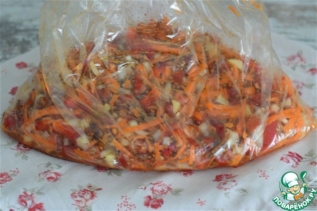Хорошо потрясти рукав для запекания. Таким образом гречка, овощи и специи равномерно перемешаются.