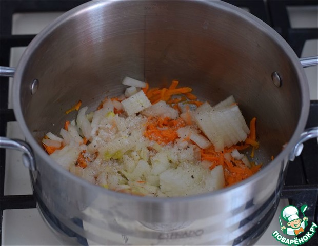 Жарить морковь с луком минуты три. -
