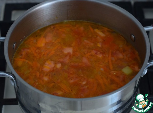 Влить в кастрюлю воду или овощной бульон. Густоту супа регулируйте по своему желанию.