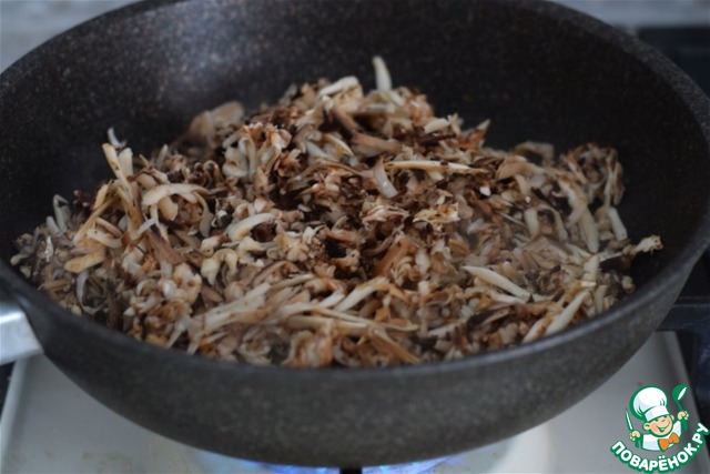 Шампиньоны натереть на крупной терке и обжарить до готовности в растительном масле. -