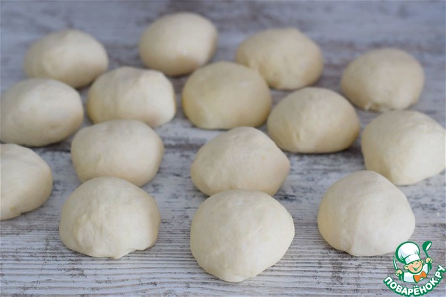 Выложить тесто на рабочую поверхность (можно немного смазать стол раст. маслом), обмять, разделить на 14-15 равных частей.