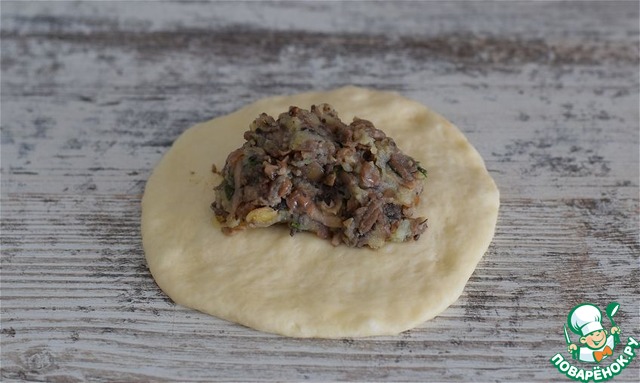 Каждую заготовку раскатать в лепешку, в середину лепешки выложить столовую с горкой ложку начинки.