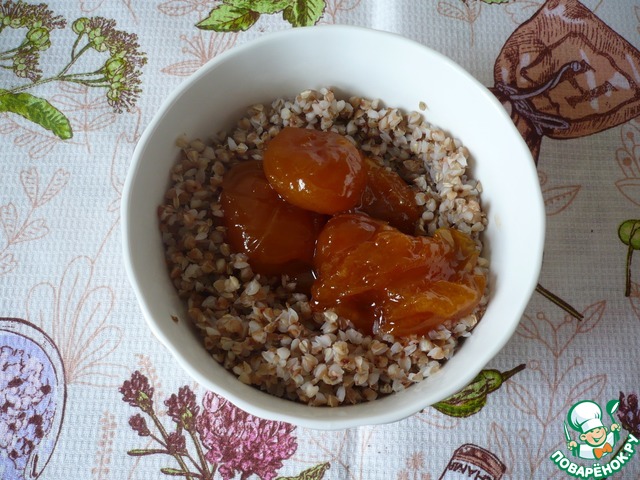 Во вторую половину гречки добавляем абрикосы из варенья без сиропа.