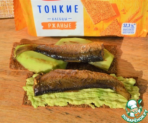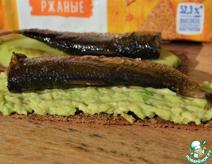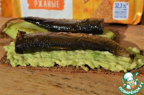 Приготовление бутербродов наипростейшее. На чёрный хлеб положить авокадо, сверху шпроты. Всё!