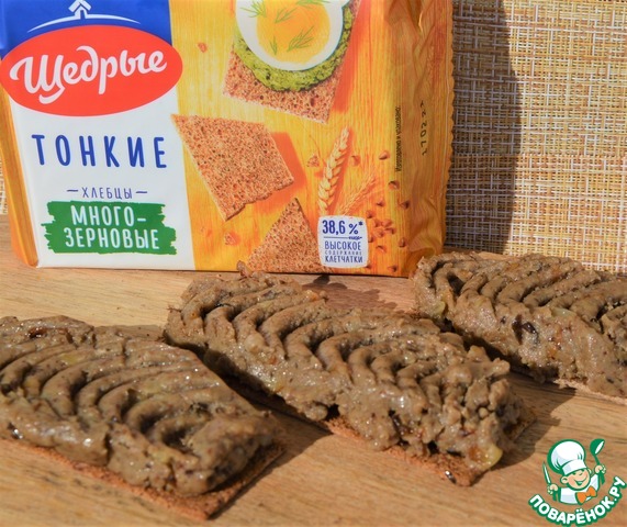• Щедро намазываем паштет на "Щедрые" тонкие хлебцы и подаём к столу. Приятного аппетита!