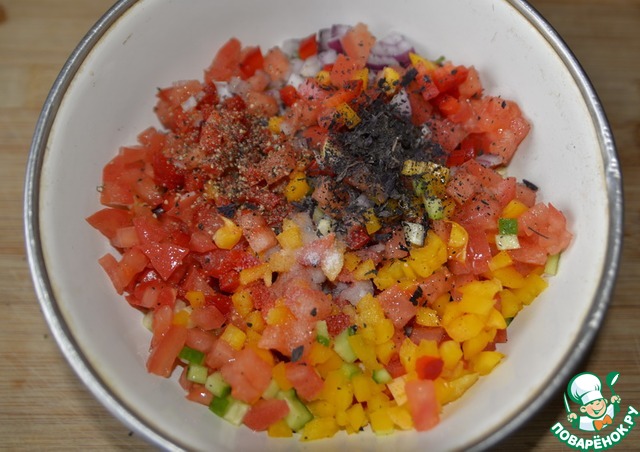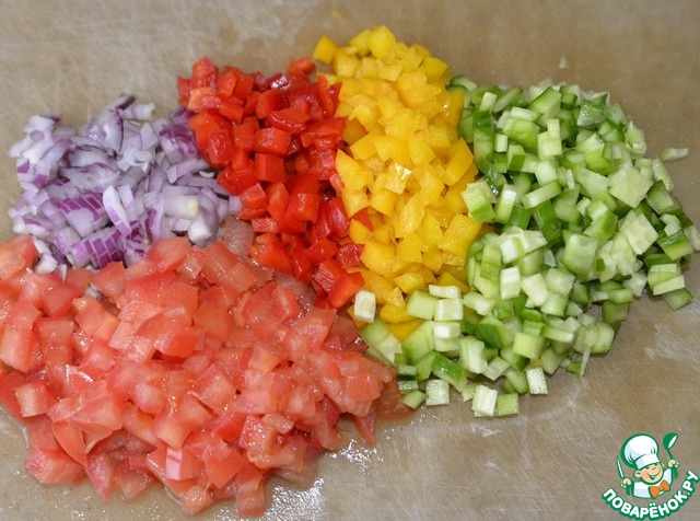 Овощи моем, лук и перцы чистим. Всё режем, по возможности, очень маленькими кубиками.