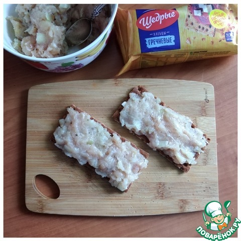 Намазываем хлебцы фаршем. Слой примерно 1 см, чтобы фарш быстро прожарился и приготовился.